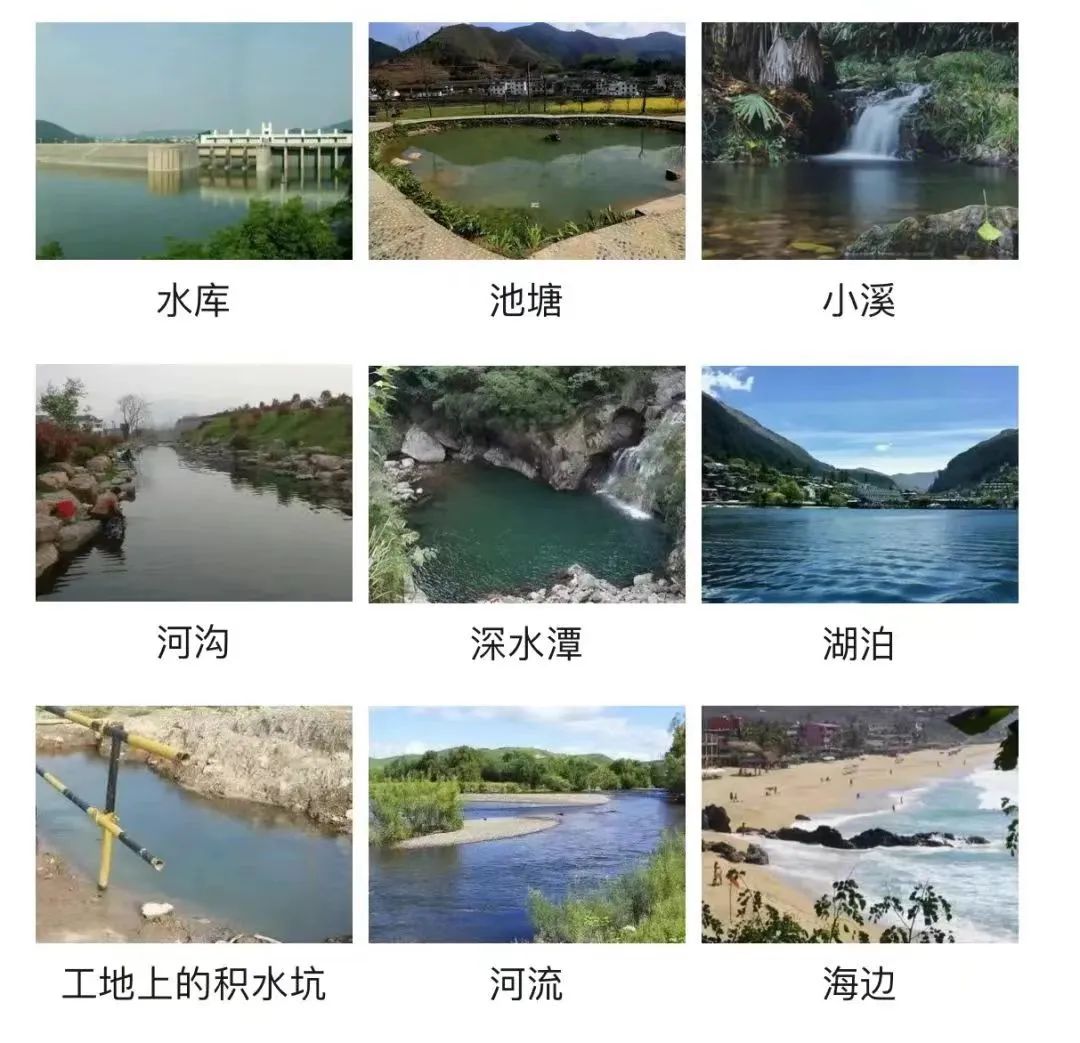 江河、水库、水塘、溪流、水潭等