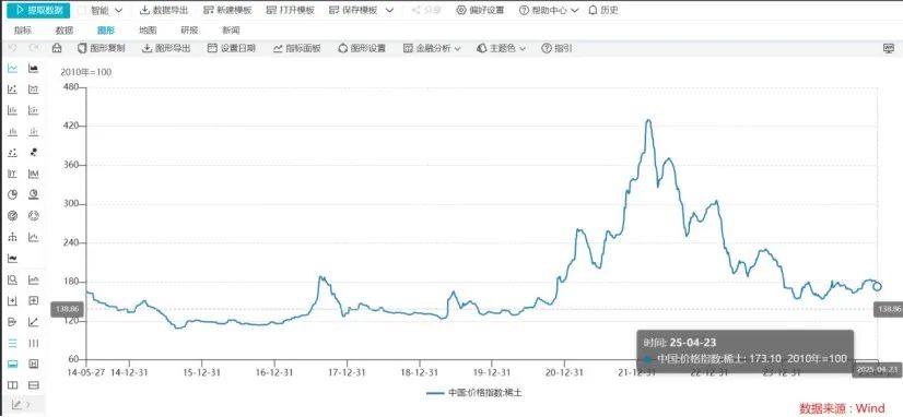 2022年2月,稀土指数超过惊人的430点之后一路下行。2024年,稀土价格指数的颓势仍未扭转,该指数由年初的198点下降至年末的163.8点,降幅超17%,年内价格指数最低点更是下探至153.3点。今年以来,价格从163点起有所上行,3月最高价格指数突破了182点,涨幅超过10%。